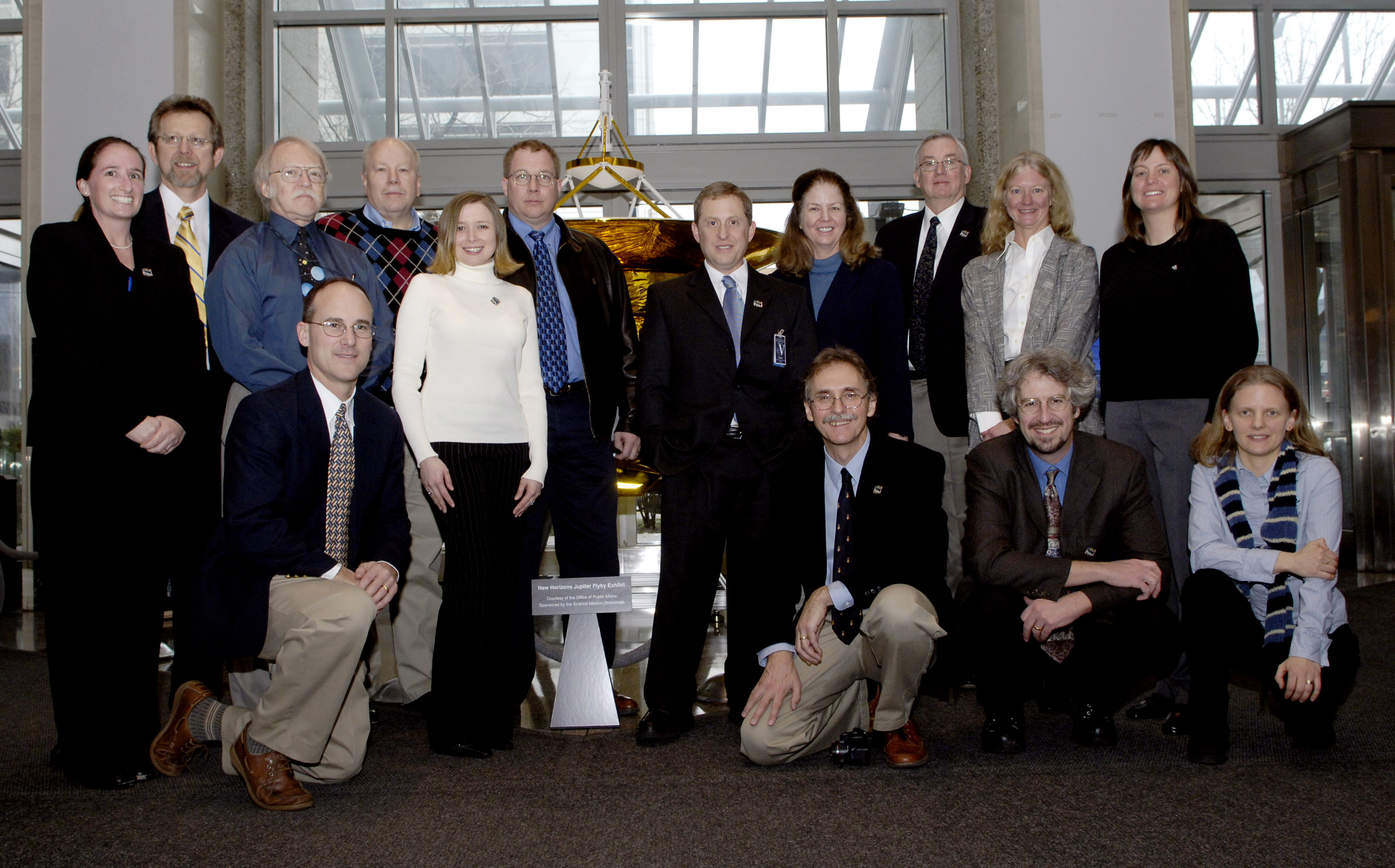This picture was taken after the New Horizons Jupiter Flyby press conference in the lobby of NASA Headquaters. The newly delivered full-scale spacecraft model is behind us.