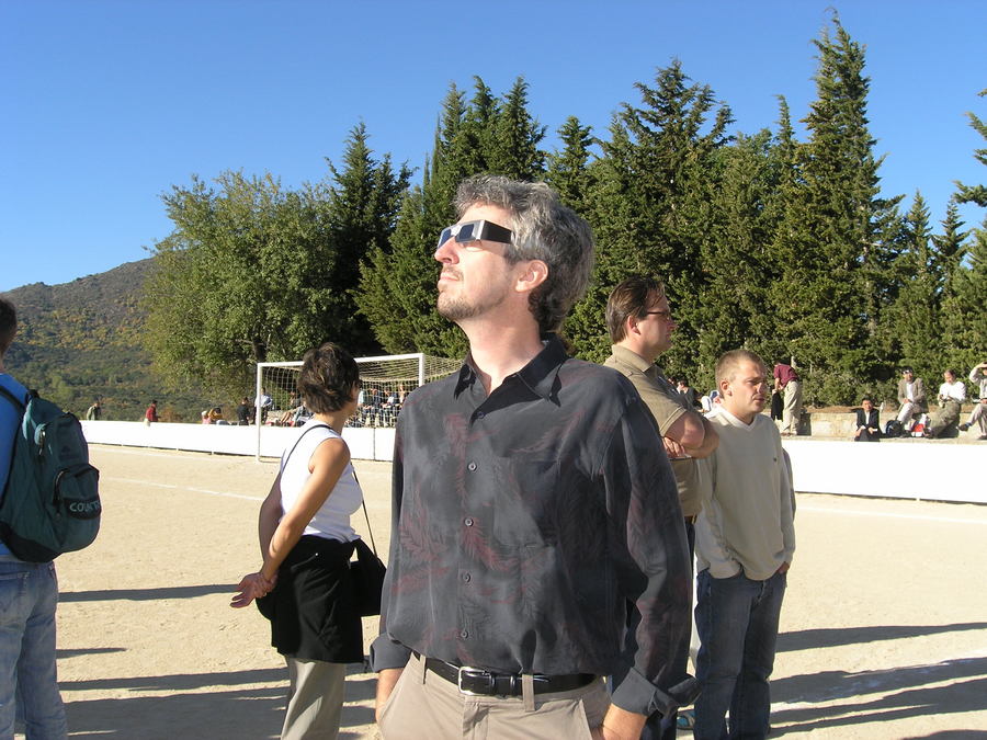 The light dims in an eerie and subtle way as the eclipse approaches. Conference members gather at an "observation point" to witness the event. Here I use the free eclipse glasses given to us. I hear glasses like this sold out in Spain!