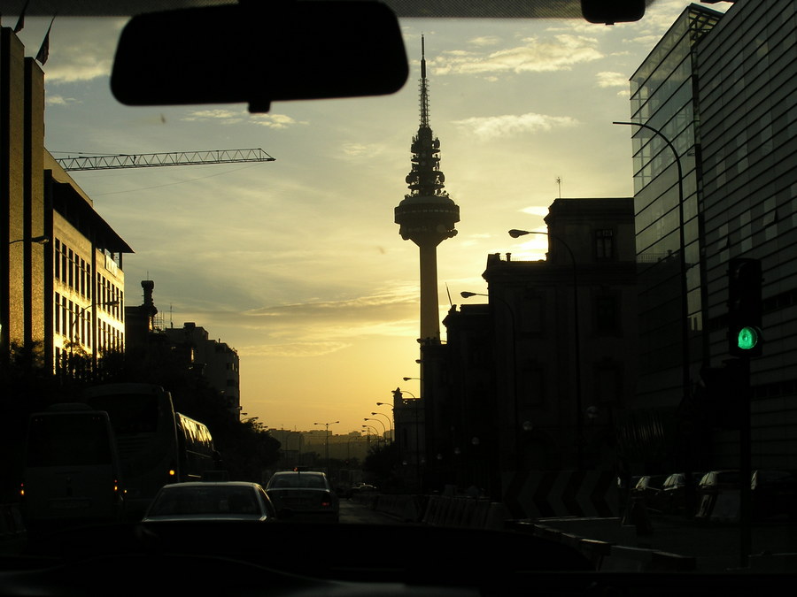 On the way to the airport, this tower is captured in dawn silhouette.